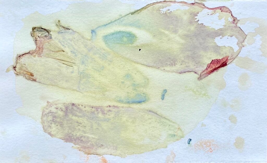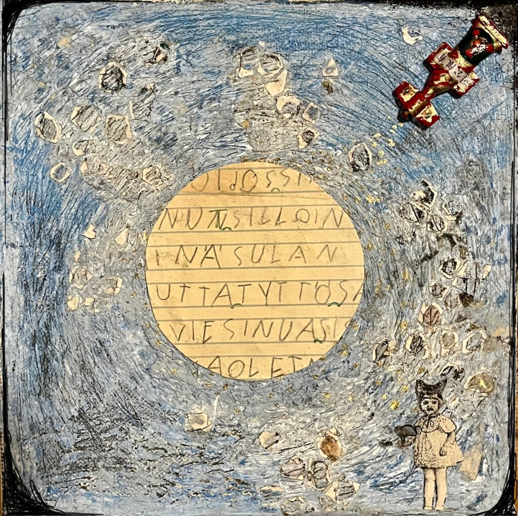 Lapsuuden loppu. Sekatekniikka, 20×20, 2025.