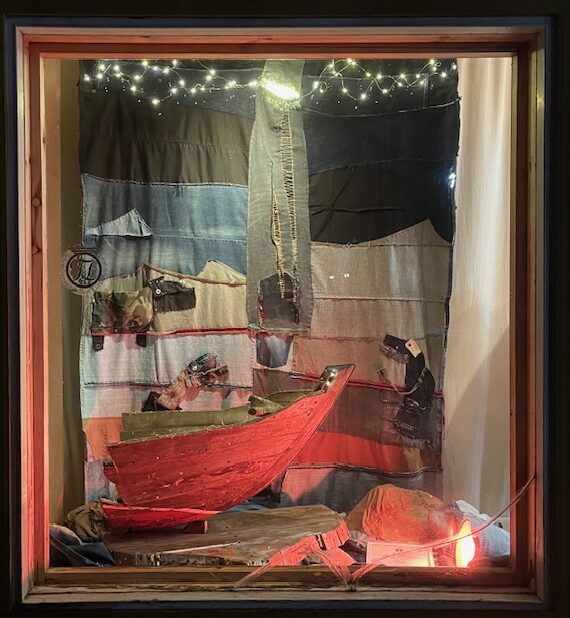 Ikiruuhi. Yrittäjiltä saaduista materiaaleista tehty yhteisteos Sirpa Suomisen kanssa. Oma osuuteni on taustan farkuista ommeltu tekstiiliteos, koko 220×160, yritysomistuksesa.