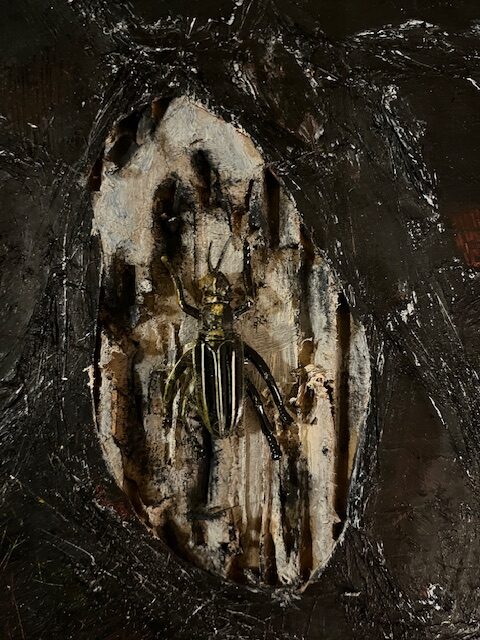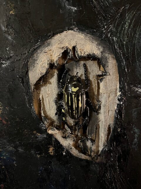 Ötökäverkko, yksityiskohtia tekeillä olevasta teoksesta. Muoviötökät, pakkauspahvi, öljyväri. Teoksen koko 120×93.