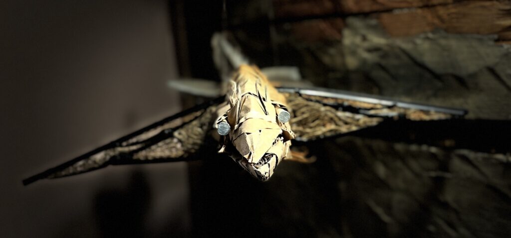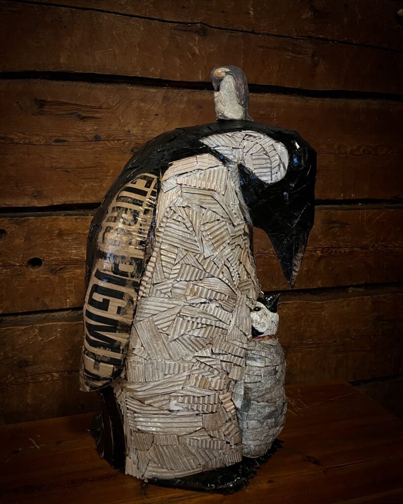 Symbioosi (niskassaan keraaminen Symbioosi), pakkauspahvi ja akryyliväri, 65 cm, 2024.