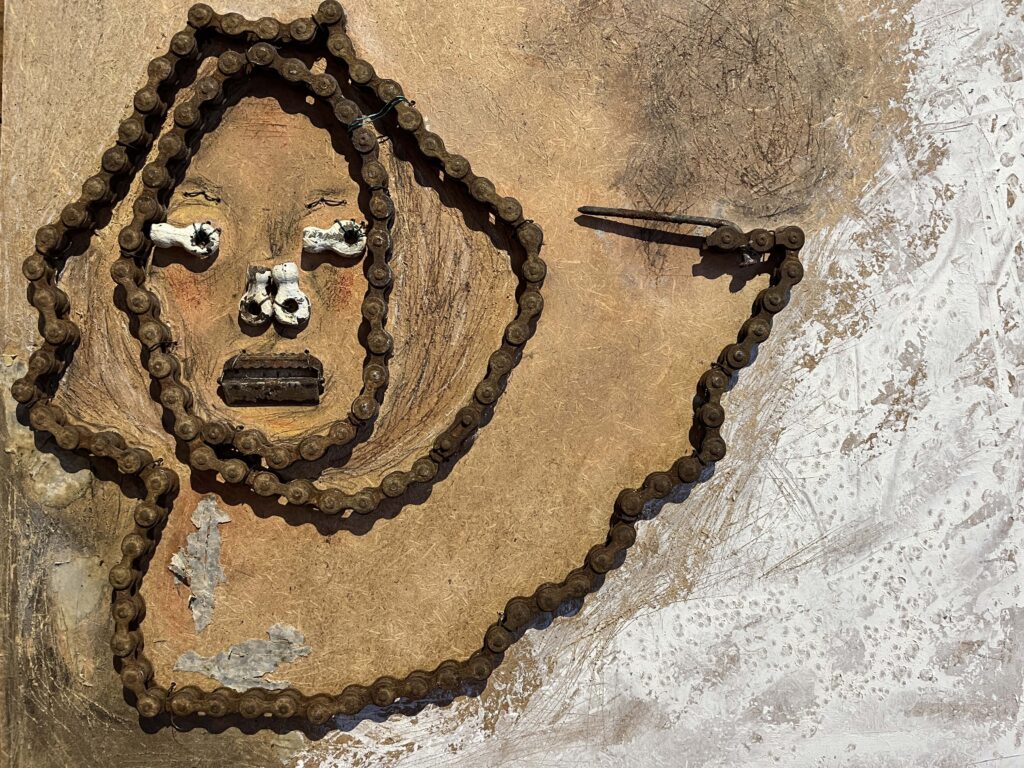 Saatan olla itse itseni pahin uhka. Kierrätysmateriaalit puulevyllä, 50×30, 2024.